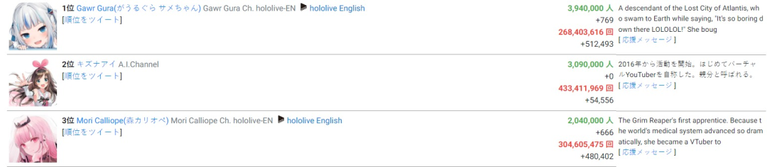 在hololive败走B站以后,这家日本虚拟主播机构便专注做起了欧美出海,持续培养小鲨皇Gawr Gura、女死神森美声等英文虚拟主播,取得了相当不错的成绩,其中Gawr Gura经过一年多的运营,在YouTube上的粉丝超过了此前的稳居首位的绊爱,森美声如今粉丝也突破了200万,和绊爱只有100万粉丝的距离。